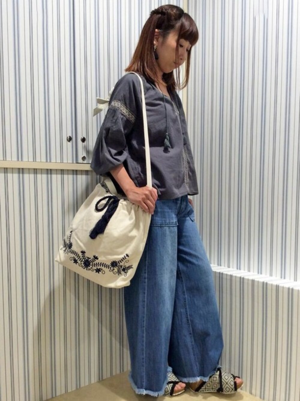 夏のおすすめパンツコーデ。 トップスは、ちょっぴりエスニックな気分になれる刺繍ブラウス。 グレー×デニムにモノトーンの小物づかいが大人の印象♪