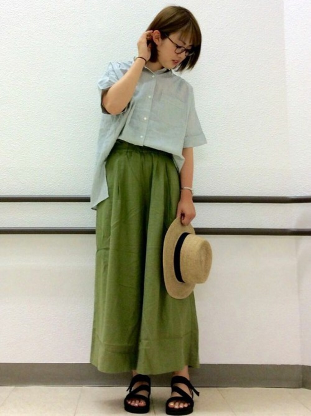 夏のらくちんパンツスタイル。 麻混で涼しく、レーヨン混で適度に落ち感のあるワイドパンツは、ウエストゴムで履きやすいだけでなく、タック入りでキレイに見える万能なアイテム。 やさしいグリーンは、あわせるアイテム次第できれいめにもカジュアルにもアレンジしやすくておすすめです♪
