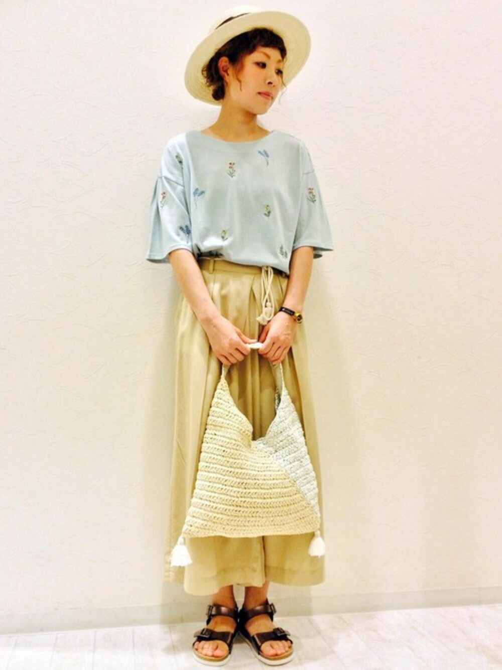 ベージュベースでまとめた夏のナチュラルコーデ。 野花を思わせるボタニカルテイストの花柄刺繍を全面に施したトップスは、一枚でも着やすいフレア袖&バックに布帛切替えがはいったデザイン性の高いアイテム。 優しいカラーづかいで着回しやすいのもうれしいポイントです。 夏小物は、部分的にはいったクロが全体のアクセントになっています♪
