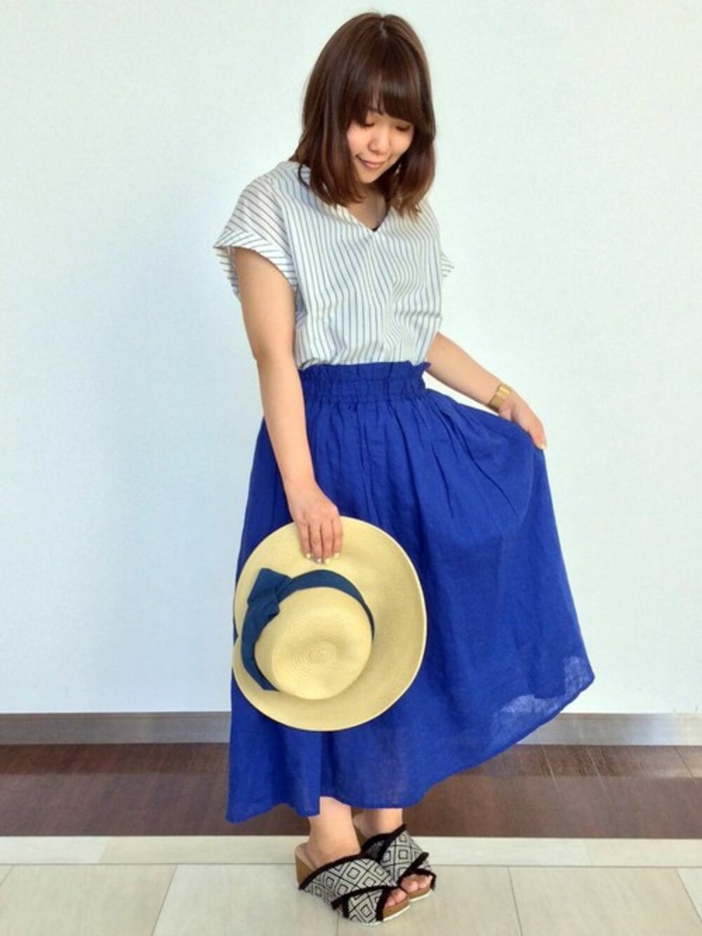 さわやか夏のおでかけコーディネート。 サイドにタックを入れることでシルエットにニュアンスを出したブラウスは、洗いのかかった風合いが見た目にも涼しく、直接肌に触れても心地よいソフトな生地感の一枚。 パキッとしたカラーがインパクト◎のスカートとあわせてフレッシュな雰囲気に仕上げました♪