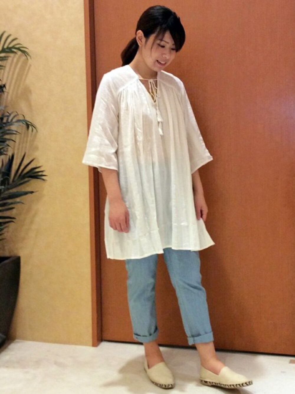 ホワイト×ライトブルーが爽やかな夏コーデ。 ふんわりボリューム感がフェミニンな印象のチュニックワンピースは、パンツとの相性◎ 長めの丈感で気になる部分もすっきりカバーしてくれます♪