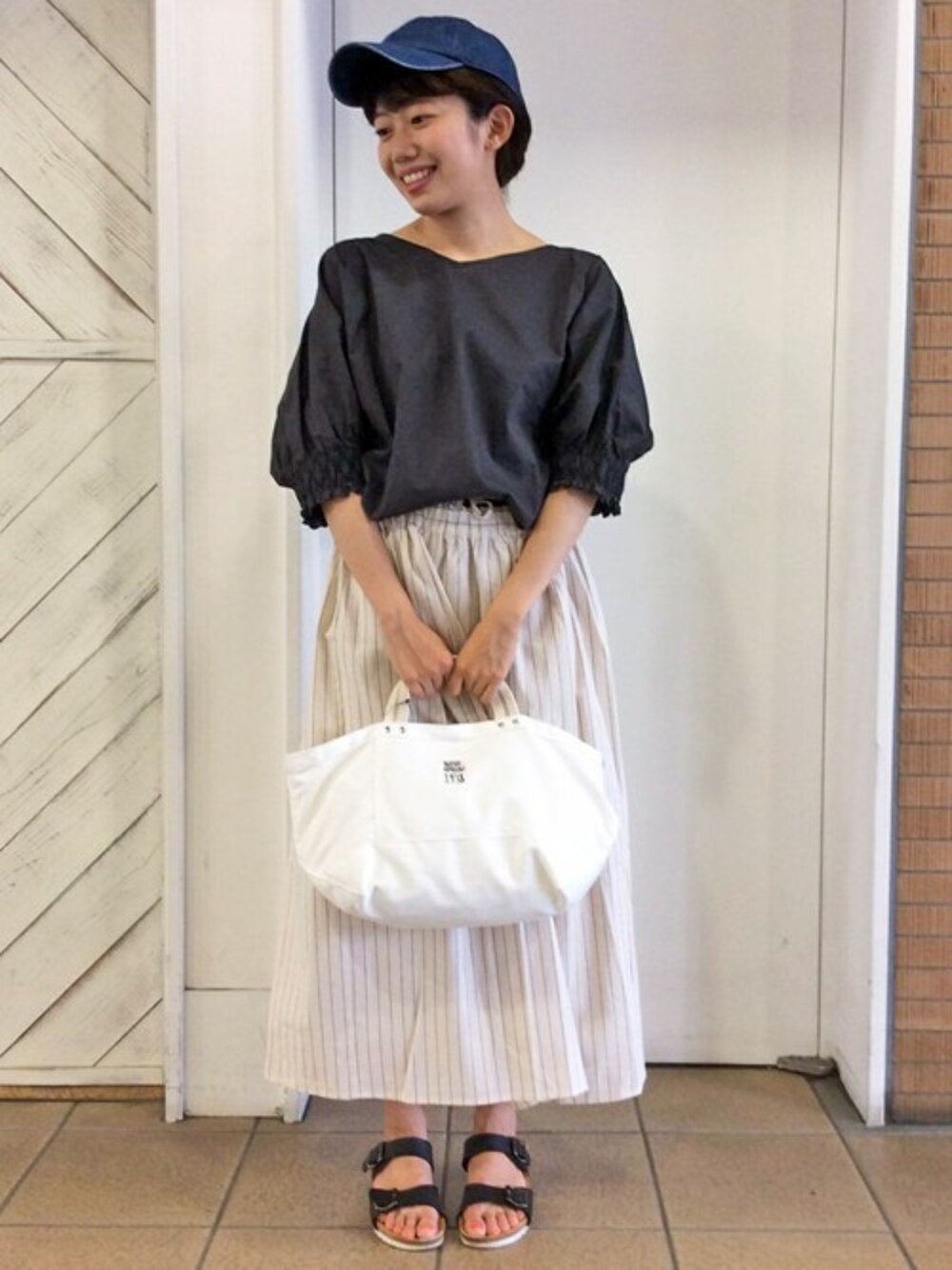 夏のモノトーンコーデ。 トップスの袖口シャーリング&ギャザースカートのふんわりシルエットがモノトーンのハードさを柔らかくしてくれます♪