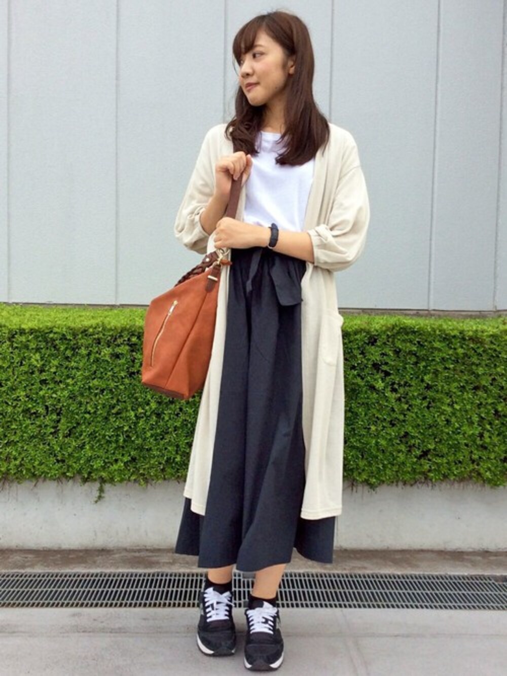 ロング×ロングの上級コーデ♪ 今年らしいふんわりスリーブのロングカーディガンは、季節の変わり目にうれしい一枚。 パンツはもちろん、ロングスカートとあわせて縦ラインをきれいにみせると全体のバランスも◎