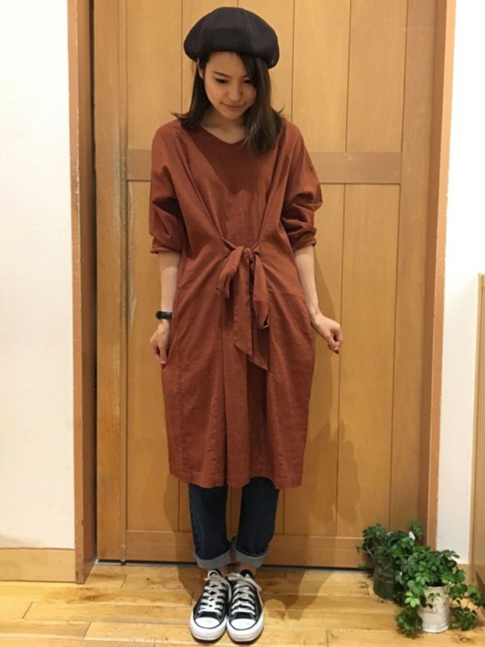 ナチュラル×カジュアルなワンピースコーデ。 素材感が人気のリネンレーヨンのワンピースは、落ち感が出てシルエットがきれいな一枚。 デザインはフロントリボンでウエストまわりもすっきりです♪