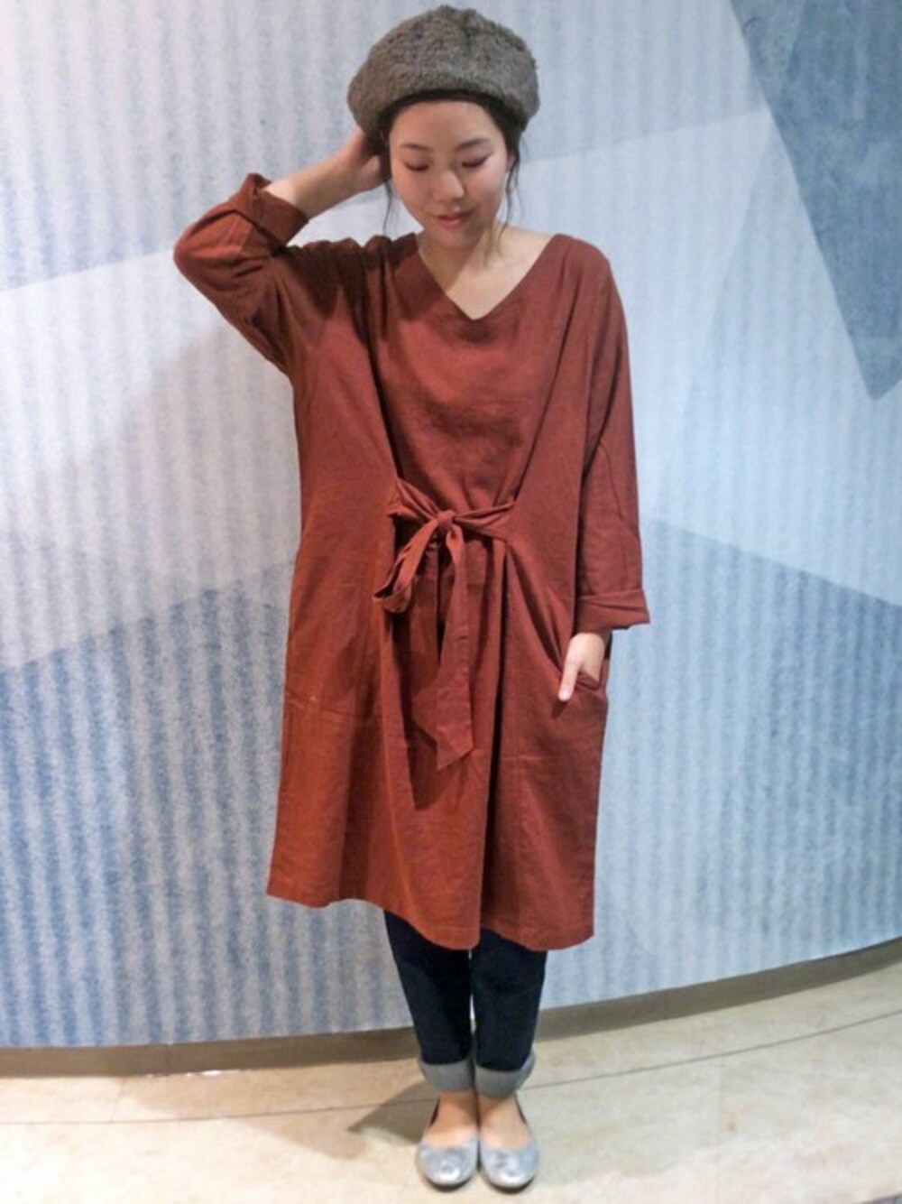 ワンピース×パンツの人気コーデ。 ビッグシルエットが今年らしいワンピースは、トレンドのブラウン系。 フロントリボンがアクセントになっています♪
