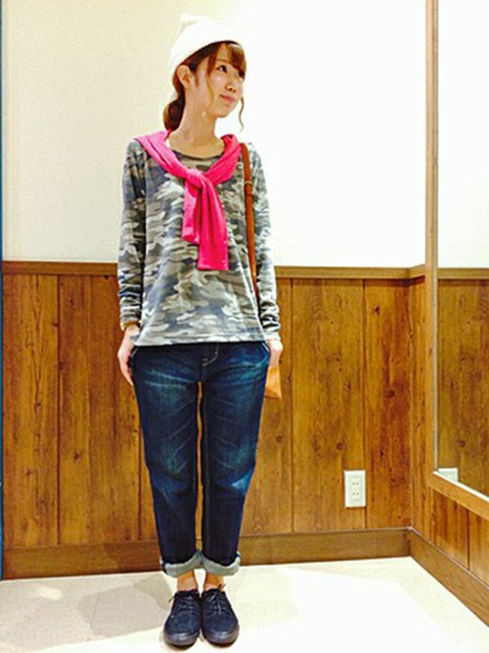 人気のカモフラ柄をメインにコーディネートしました。 ロンTは胸ポケ付きなので1枚で着てもキマリます。 ハードな印象にまり過ぎないようピンクのカーデで女性らしさをプラスしました。