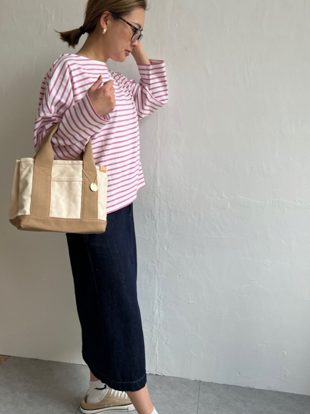 ピンクのボーダーでアクセント❣️ デニムスカートでラフだけどお洒落なスタイリングに⭐️