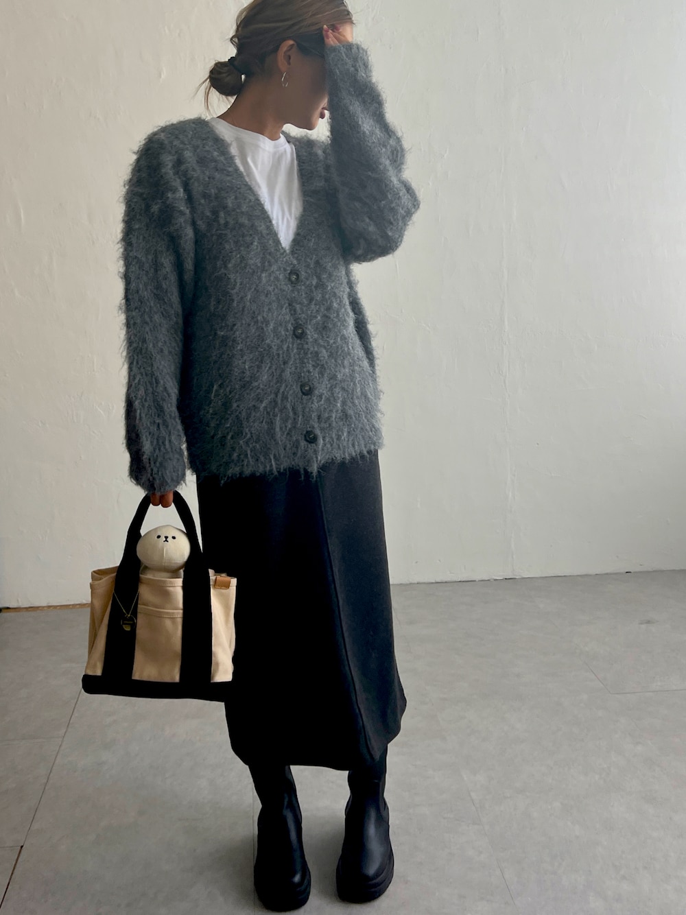 秋だから大人コーデでお洒落に❣️ モコモコニットカーディガン✖️タイトスカート😍