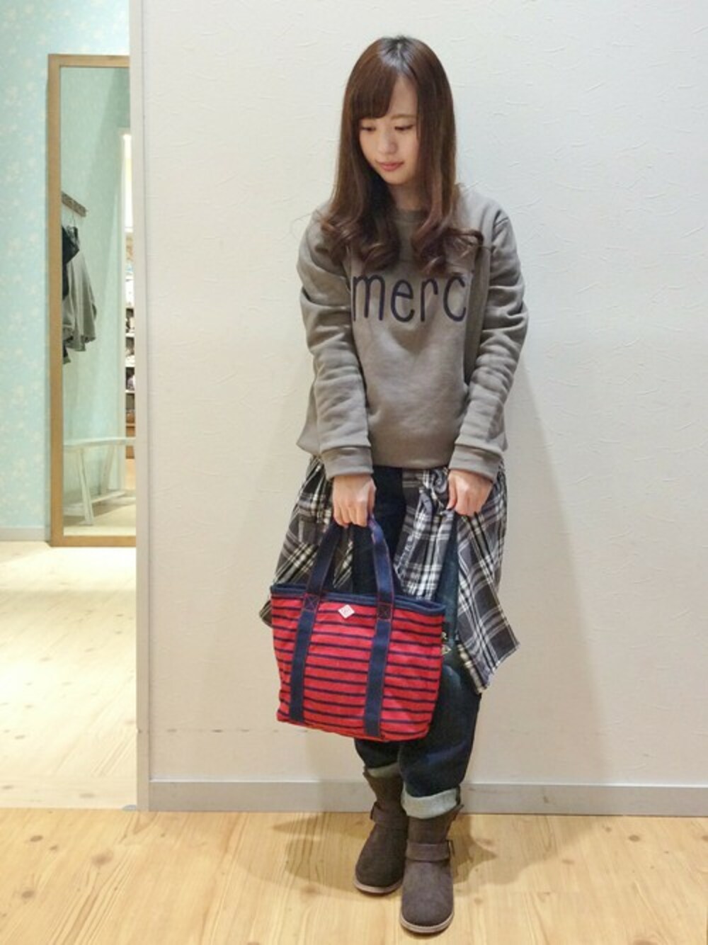 ロゴスウェット×デニムのボーイズライクなコーディネート。 プラス腰巻きシャツでこなれた感を演出しました。 エンジニアブーツはデニムロールアップで見える量を増やすのが○