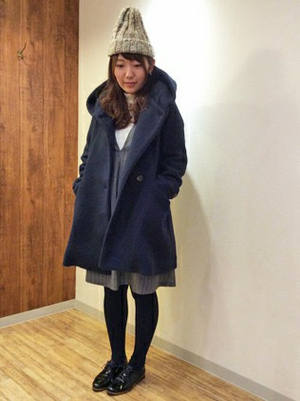 ロングコートに深いVネックのワンピースを合わせ、縦ラインを強調した美ライン・スタイリング。 ワンピースは前がざっくりとV字に空いていて、袖なしの今人気の形となっております! ワンピースの甘さを、ストライプでクールにも見せてくれます。 アウターはフードが大きく印象的、前開きと閉じているので全く違う雰囲気を出すことができます。