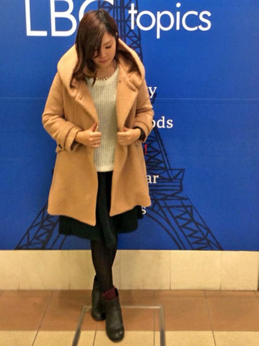 モノトーンにまとめたコーデにベージュのロングコートを合わせたトレンド感あふれるスタイリング。 コートはややAラインのシルエットで合わせやすくオススメですよ。 フード付きですが装飾があまりなくシンプルで、カジュアルになりすぎないのでお出かけにもぴったりです。 小物はブーティやアクセ使いでおとなっぽくまとめました。