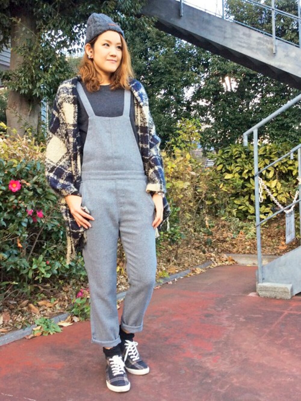 すっきりシルエットのおとなサロペット。薄くて柔らかくてあったかいサロペットです。 インナーにはトレンドのチビハイネックニットを合わせました。 コーディネートはグレートーンでまとめ、マフラーのチェック柄をポイントに♪