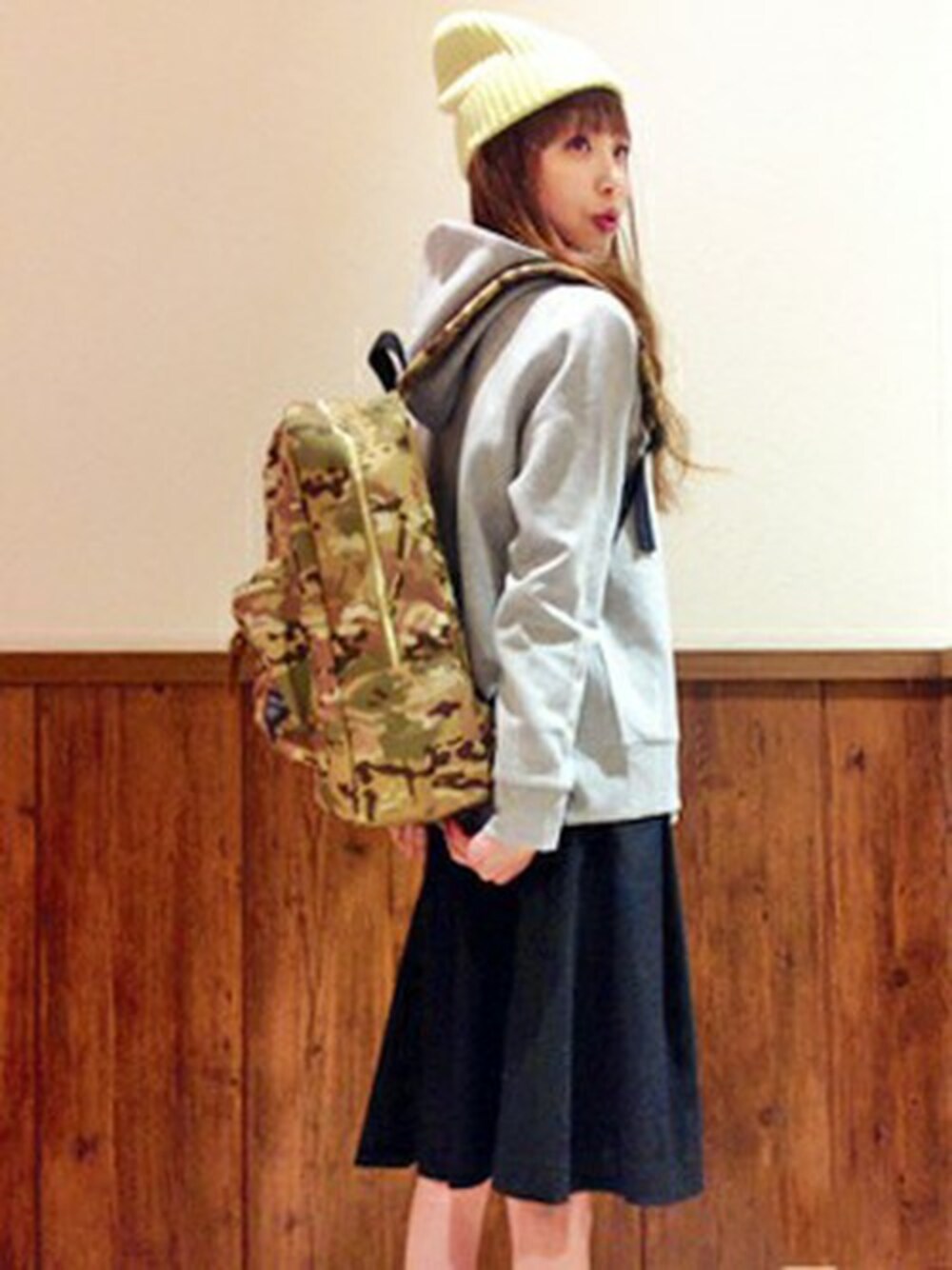 まだまだ大活躍のパーカーとシンプルなデザインなのに小洒落たファスナー使いが目をひくスカートのコーデ。 カモフラ柄のリュックがカジュアル感を出してます。 明るいイエローが目を引くニット帽をアクセントに♪