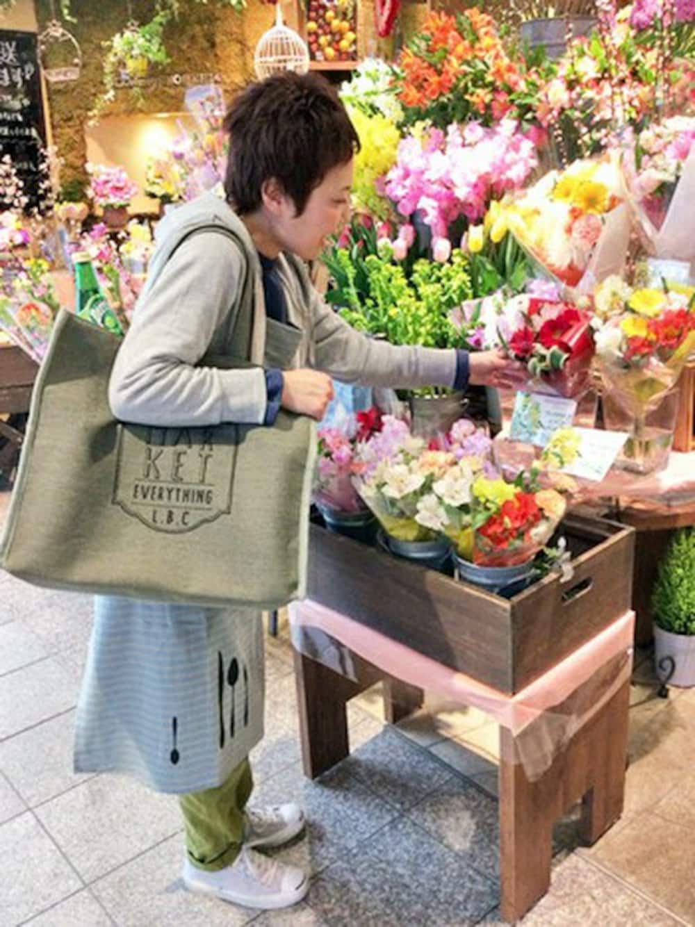 今日はホームパーティーの為の買い出しスタイル。 エプロンはボーダー×カトラリープリントのグッドデザイン。気分はカフェスタッフ♪ 大きなマーケットバッグは持ち手もしっかりしていて、食材の買い出しにはピッタリです! 買い物だけではなく、お部屋で雑誌入れにしてリビングに置いてもカッコ良いですね。