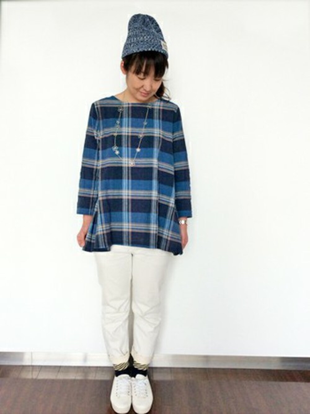 1枚で主役になる大柄チェックのチュニックをメインにコーディネート。 Aラインなのですが、広がり過ぎないように脇にタックが入り、背中はボタン仕様をこだわりのデザインです。 ニット帽やスニーカー合わせでカジュアルにまとめました。