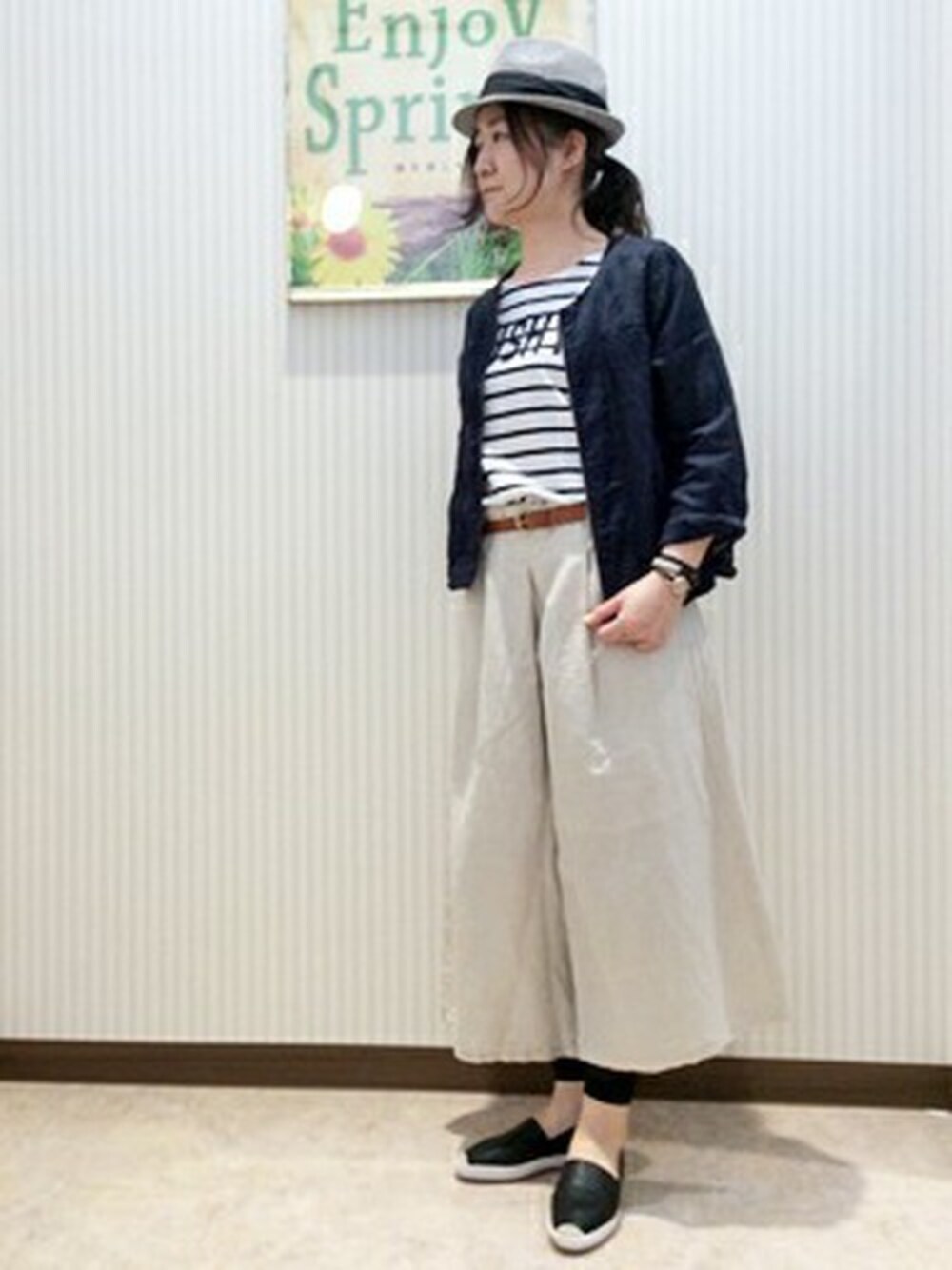 この春注目のワイドパンツには、コンパクトなノーカラーブルゾンを合わせて、対比を強調しました。 ボーダーTのプリントロゴは、高い位置にプリントされています。ベルトを締めて 足長効果◎ ハットをプラスしただけで、オシャレ度も上がります!