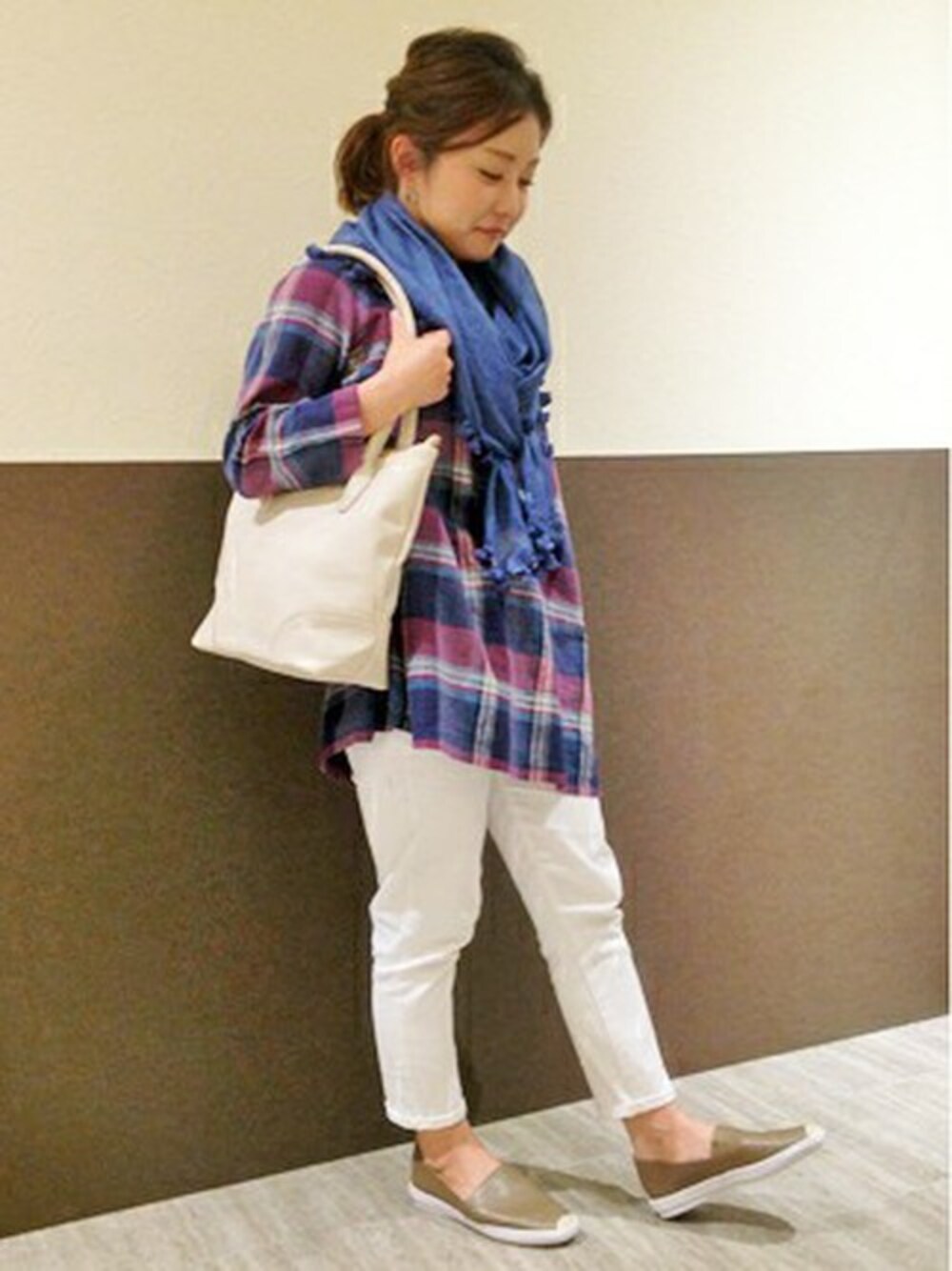 大柄チェックが春らしいシャツは、綿麻なので柔らかい肌触りで気持ちいいです。 他のアイテムは白でまとめて、チェック柄を強調しました。 今の季節はストールを巻いて、寒暖差をコントロール♪