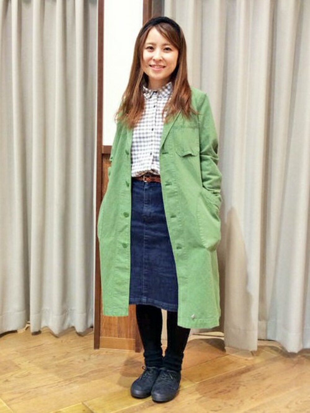 リネンの素材が魅力のショップコート。 グリーンカラーが春気分を盛り上げます。 ギンガムチェックシャツとスカートをあわせて、フェミニンな印象にまとめました。