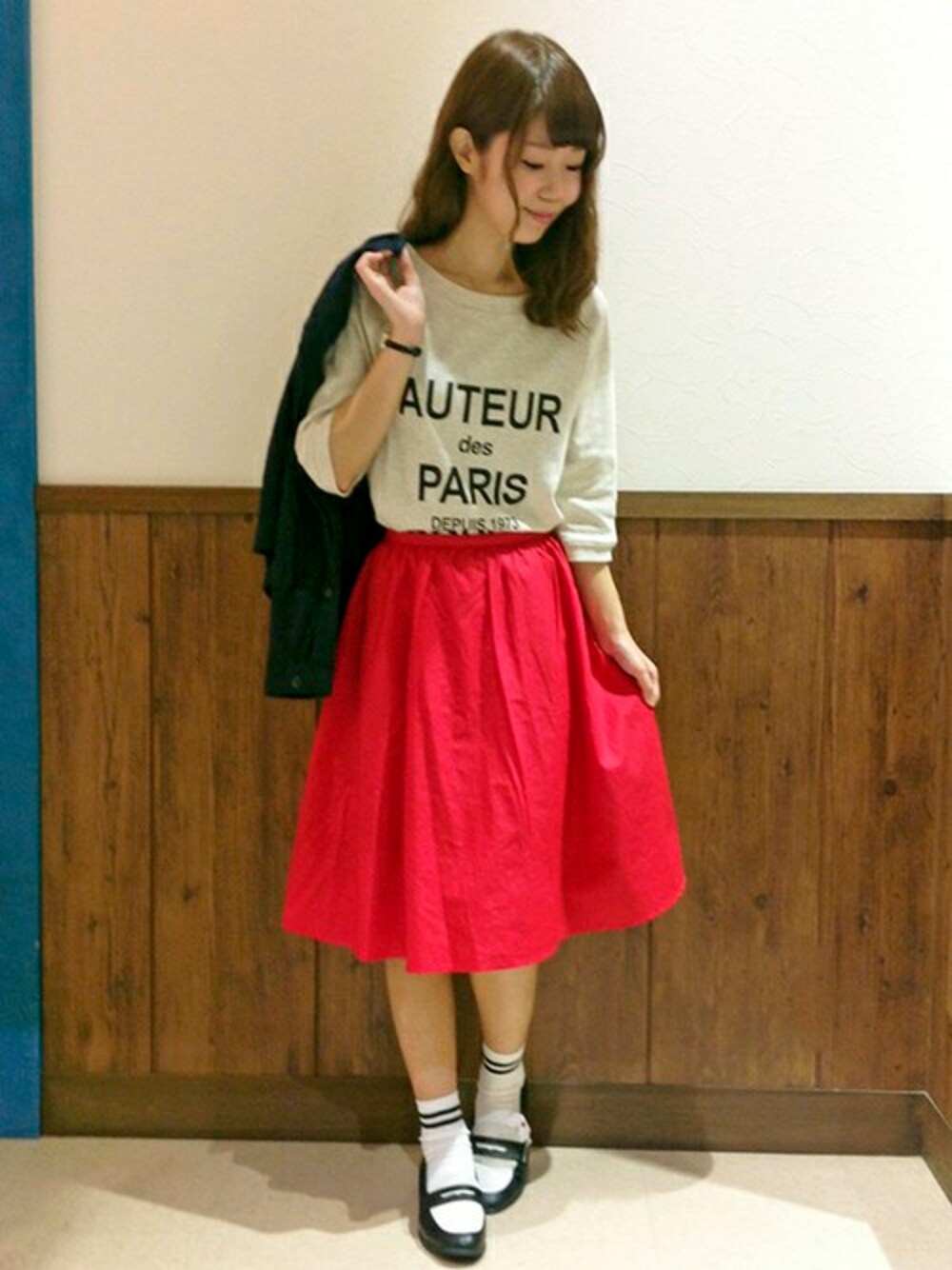 真っ赤なスカートを主役にスタイリング。 ギャザー使いがふんわり女性らしいスカートにメンズライクなロゴTを合わせてカジュアルダウンしました。 クラシカルな雰囲気のスカートにはローファーが好相性です♪