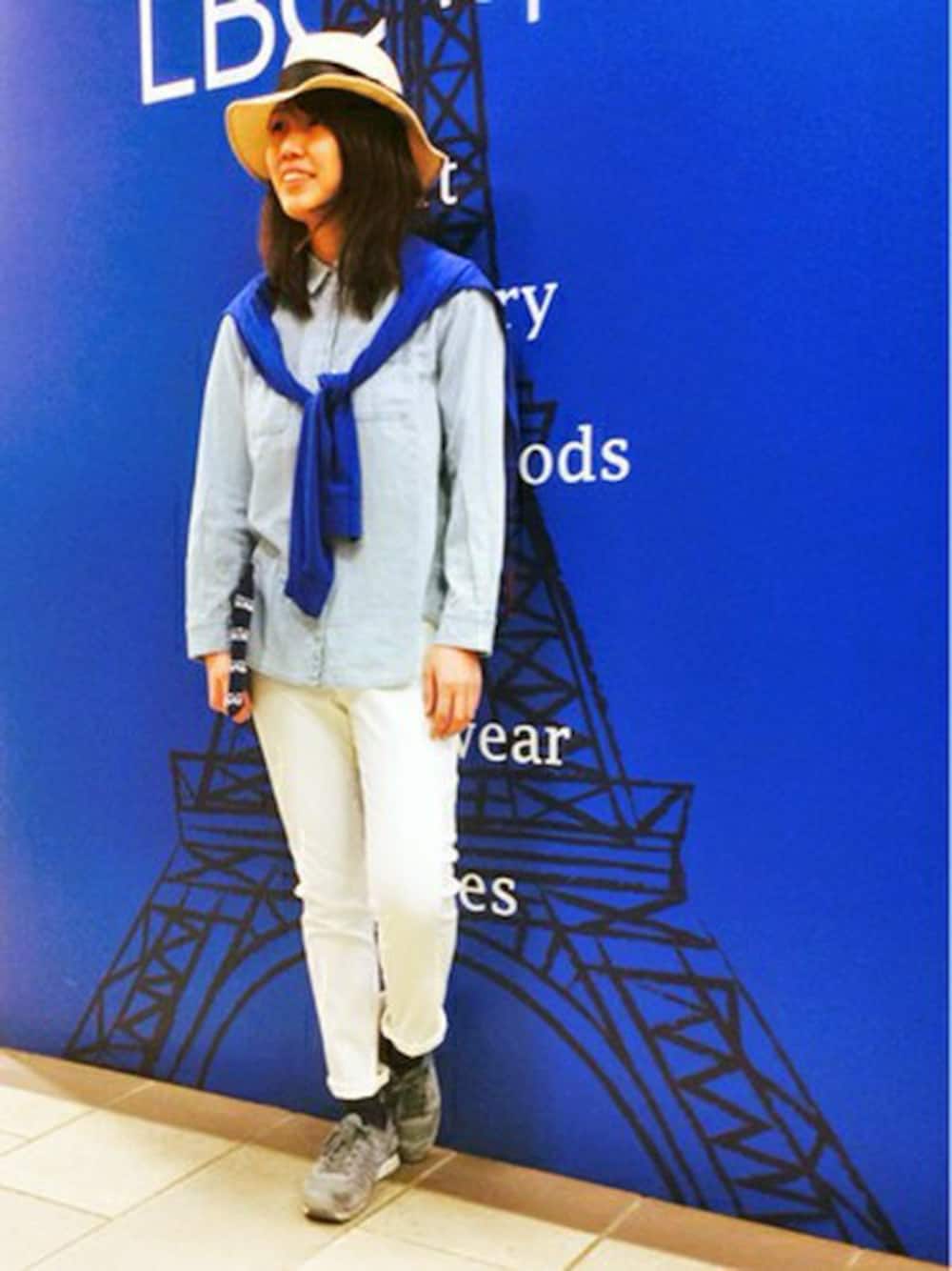 ブルー×ホワイトの春カラースタイリング。 今季大注目のインディゴシャツは、フライフロント仕立てでキレイめにもカジュアルにも着こなせる1着。 体になじむホワイトスキニーパンツを合わせて軽い印象にまとめました。