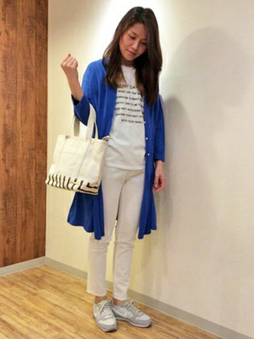 鮮やかなブルーのロングカーディガンは主役のコーディネート。 ロング丈アウターが人気の今シーズンは、カーディガンもロングに注目♪ 他のアイテムをオールホワイトでまとめた旬のスタイリングです。