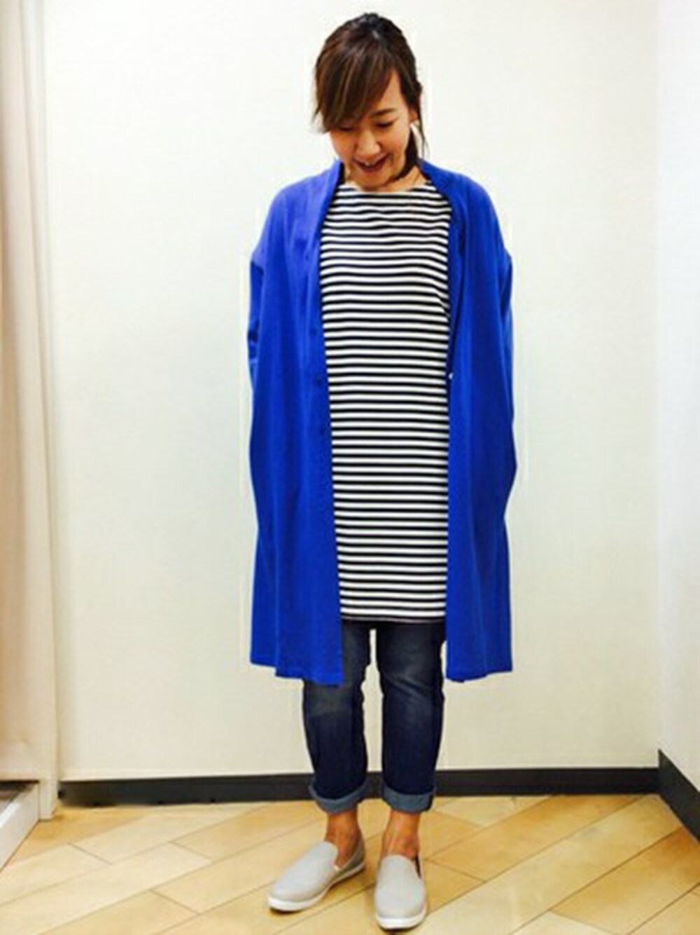 鮮やかなブルーが印象的なトッパーカーディガン。 縦のラインが強調されて、体型をスッキリ見せてくれます。 ボーダーワンピースをあわせたリラックススタイルです。 半袖なので、夏まで活躍すること間違いなしです♪