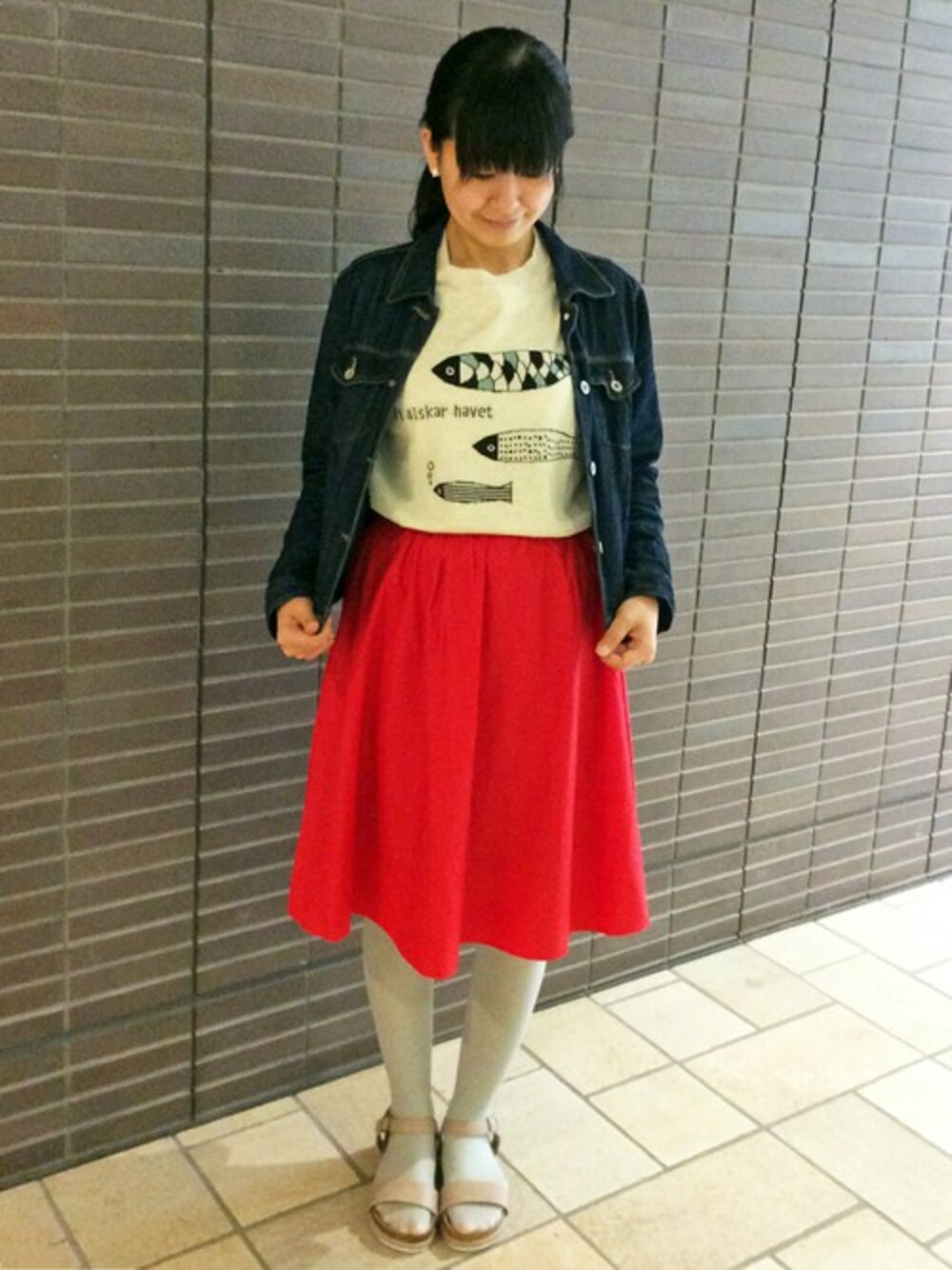 ひらりとボリューム感あるスカートは女子度アップ。 トップスはゆる~いお魚のプリントがかわいいサマーニットです♪ 足元はこの夏ブレイク必須のサンダルを合わせました。