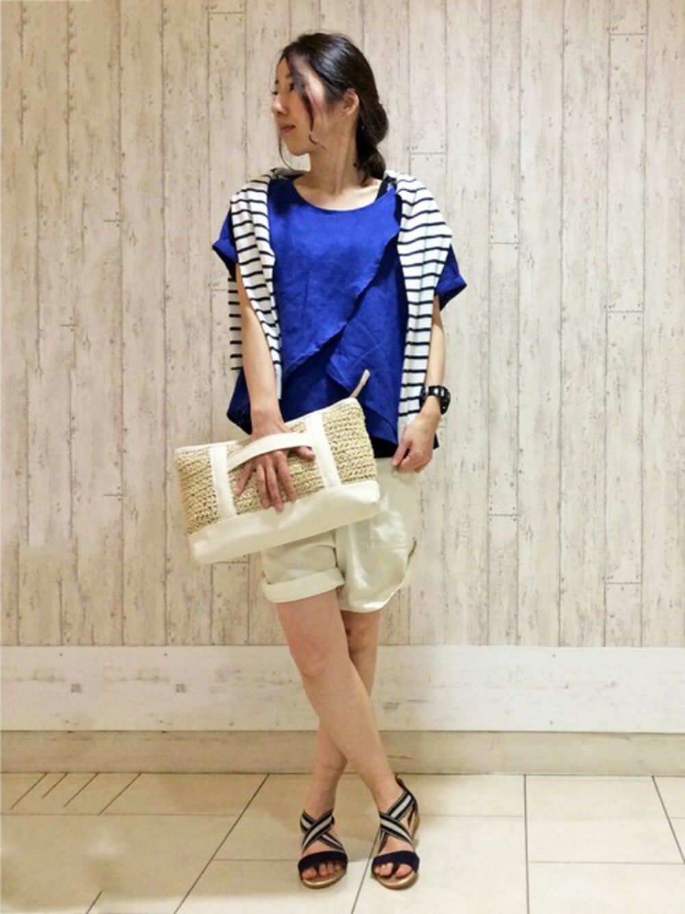 半袖ブラウスにショートパンツ、足もとはgaimoのサンダルと露出部分も多いこちらのコーディネート。 ブラウスの青が鮮やかで印象的です。 カーディガンはUVケアしてくれるので、真夏も着られます。 ブルー×ホワイトが爽やかなコーディネートです◎