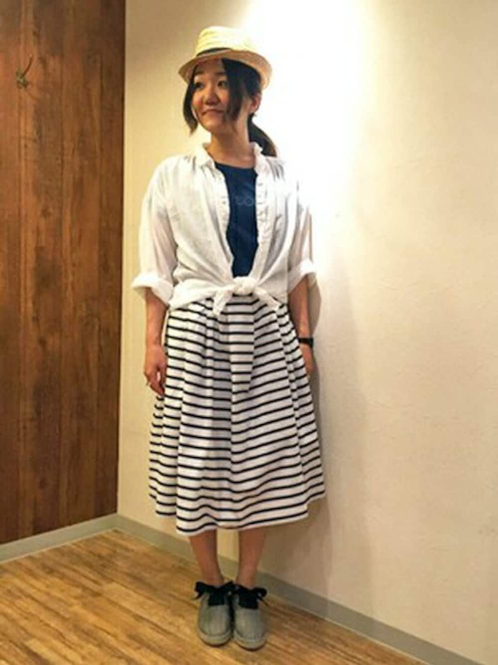 夏気分なリゾートスタイル。 ボリューミーなボーダースカートと、厚底ジュートシューズが解放感を醸し出します。 シャツの裾はもちろん縛って下さい♪