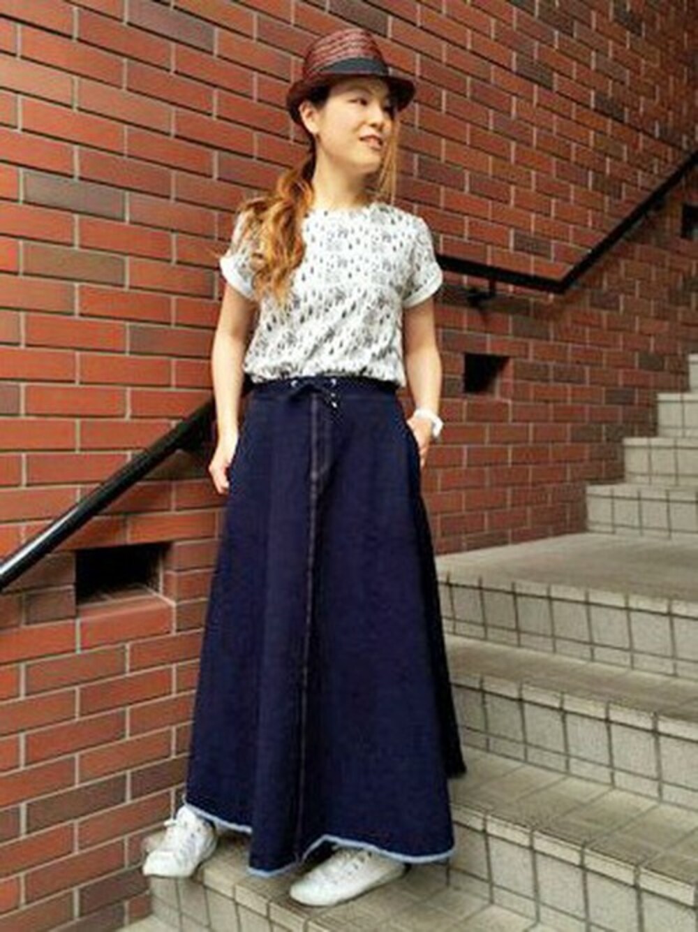スウェットスカートのらくちんコーディネート。 ロングスカートは、トップスインするとウエストまわりがスッキリして縦ラインがきれいに。 トレンドの白スニーカーをあわせるとス、ポーツテイストもプラスされて今年らしさがUPします♪