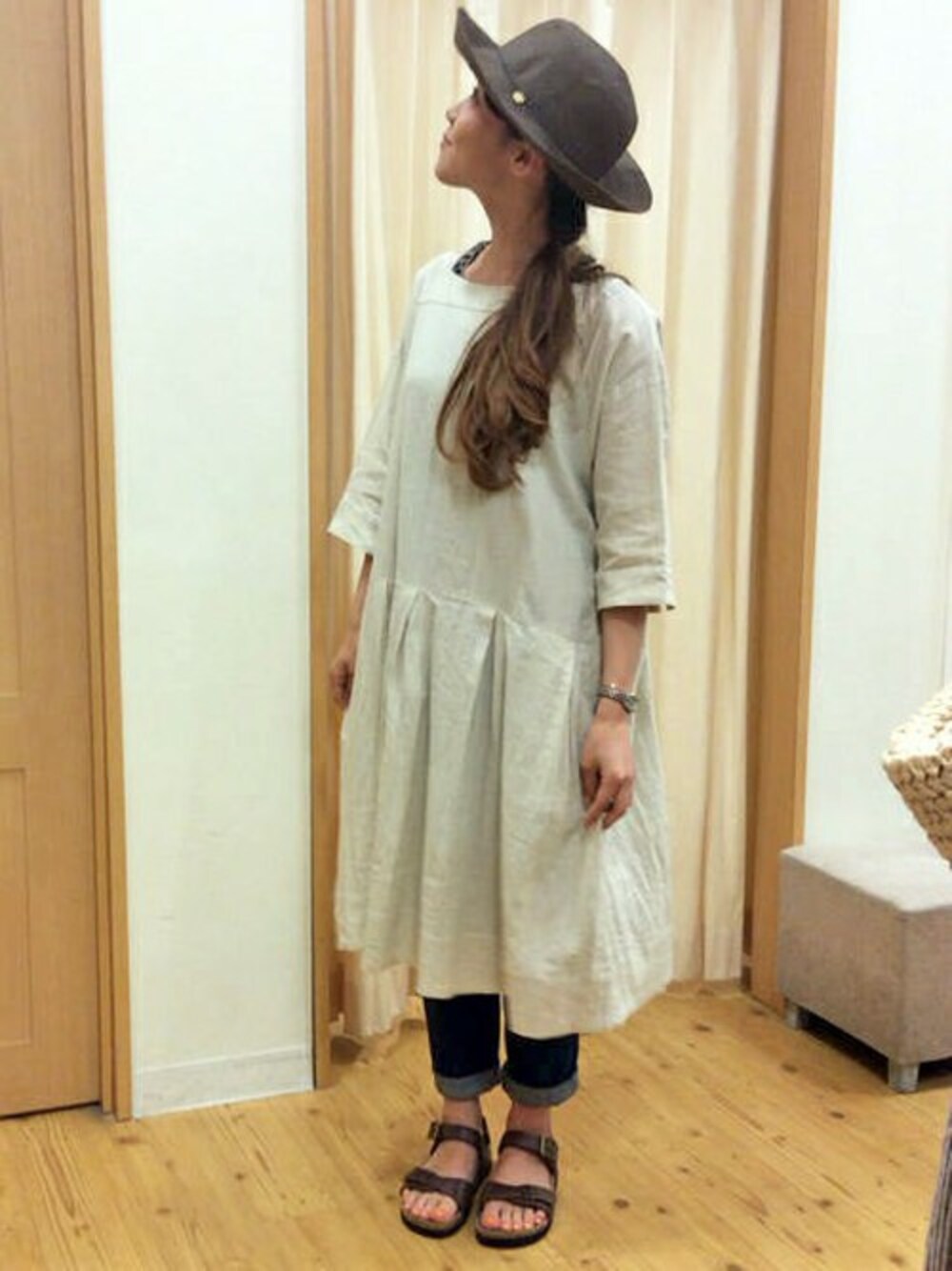 リラックスムードのワンピースコーディネートです。 ワンピースは、着心地のいいリネンレーヨン素材で、ほっこりするふんわりシルエット。 トレンドのツバヒロハットとぺたんこサンダルでのんびりおでかけしたくなります♪