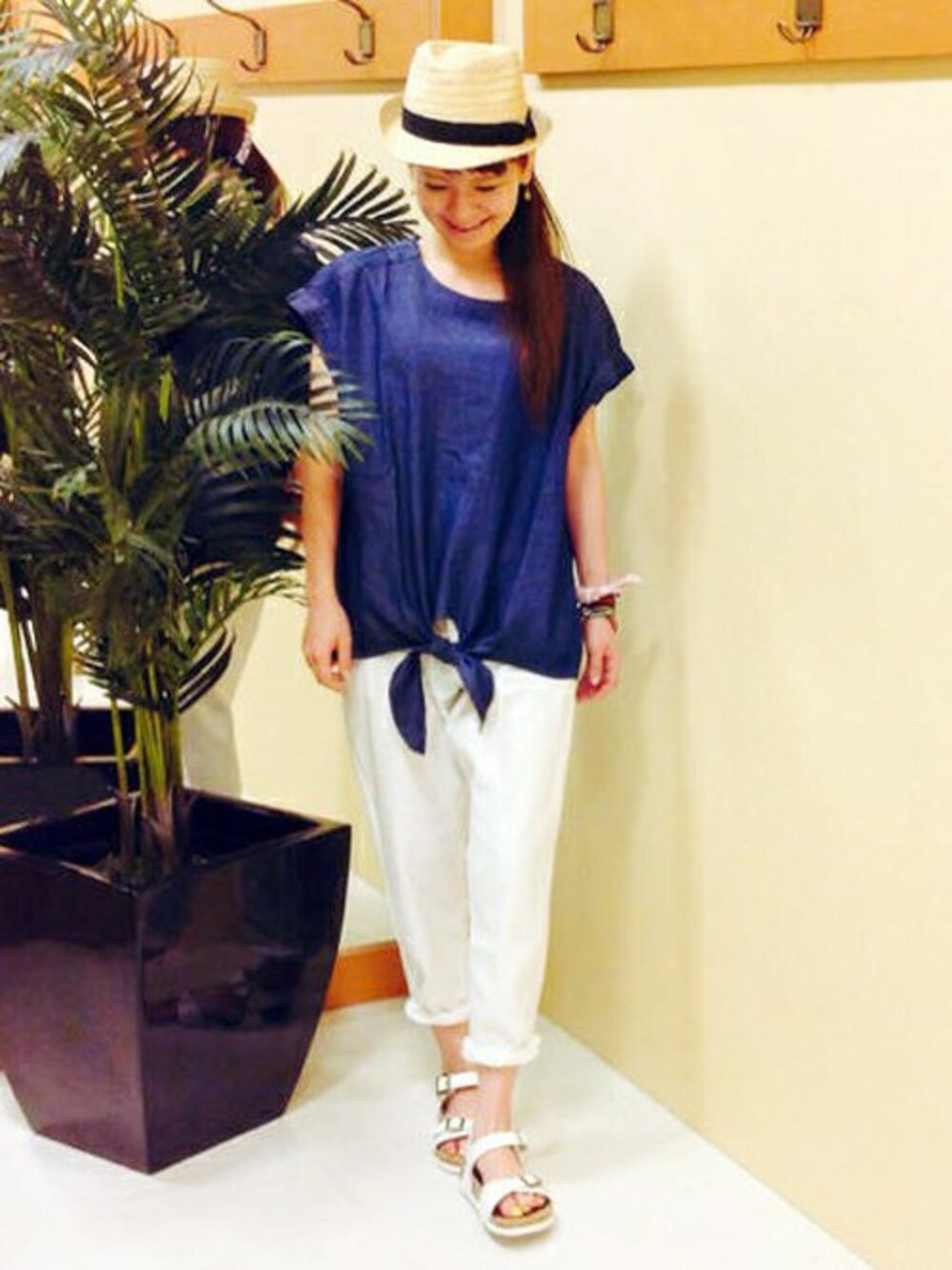 これからの暑い季節にぴったりのリラックスコーディネートです。 前縛りがポイントのブラウスとテーバードパンツのゆるい感じが涼しげな印象♪ パンツはサイドベルト付きなので、トップスインスタイルも楽しめます。