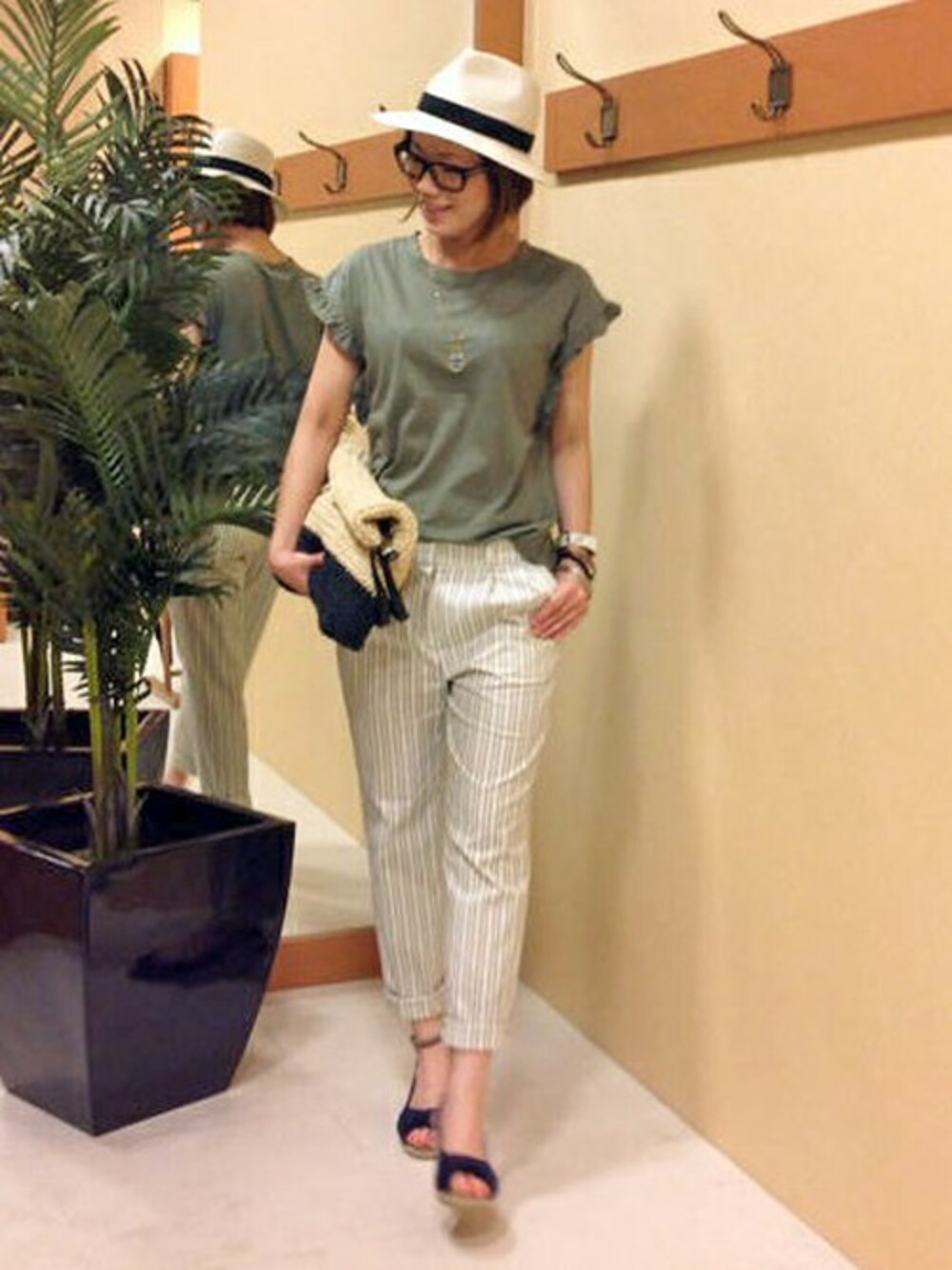 トレンドのカーキ×ホワイトのコーディネート♪ メンズライクなストライプパンツと中折れハットに、フリル袖のトップスと華奢なサンダルをあわせて女性らしさをプラスしました。 フリルのかわいいTシャツは、袖口からインがみえないデザインで、暑い季節も一枚で着れるうれしいアイテムです。