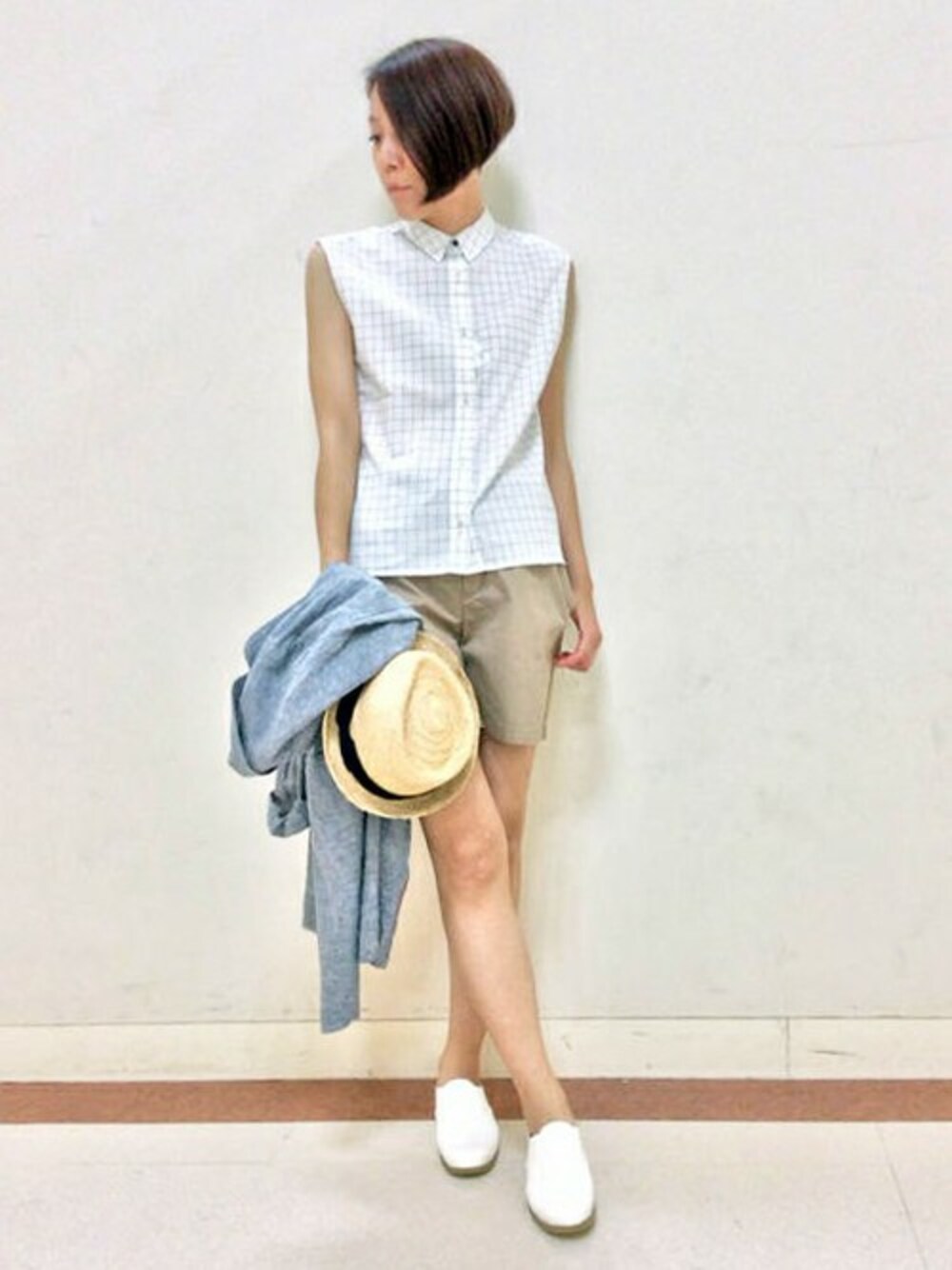 ショートパンツが新鮮なブラウスコーディネートです。 大人っぽいチェックのトップスは、ノースリーブながら肩が隠れて気になる部分をカバーしてくれるデザイン♪ 少年のようなショートパンツをあわせるとカジュアルなスタイルになります。
