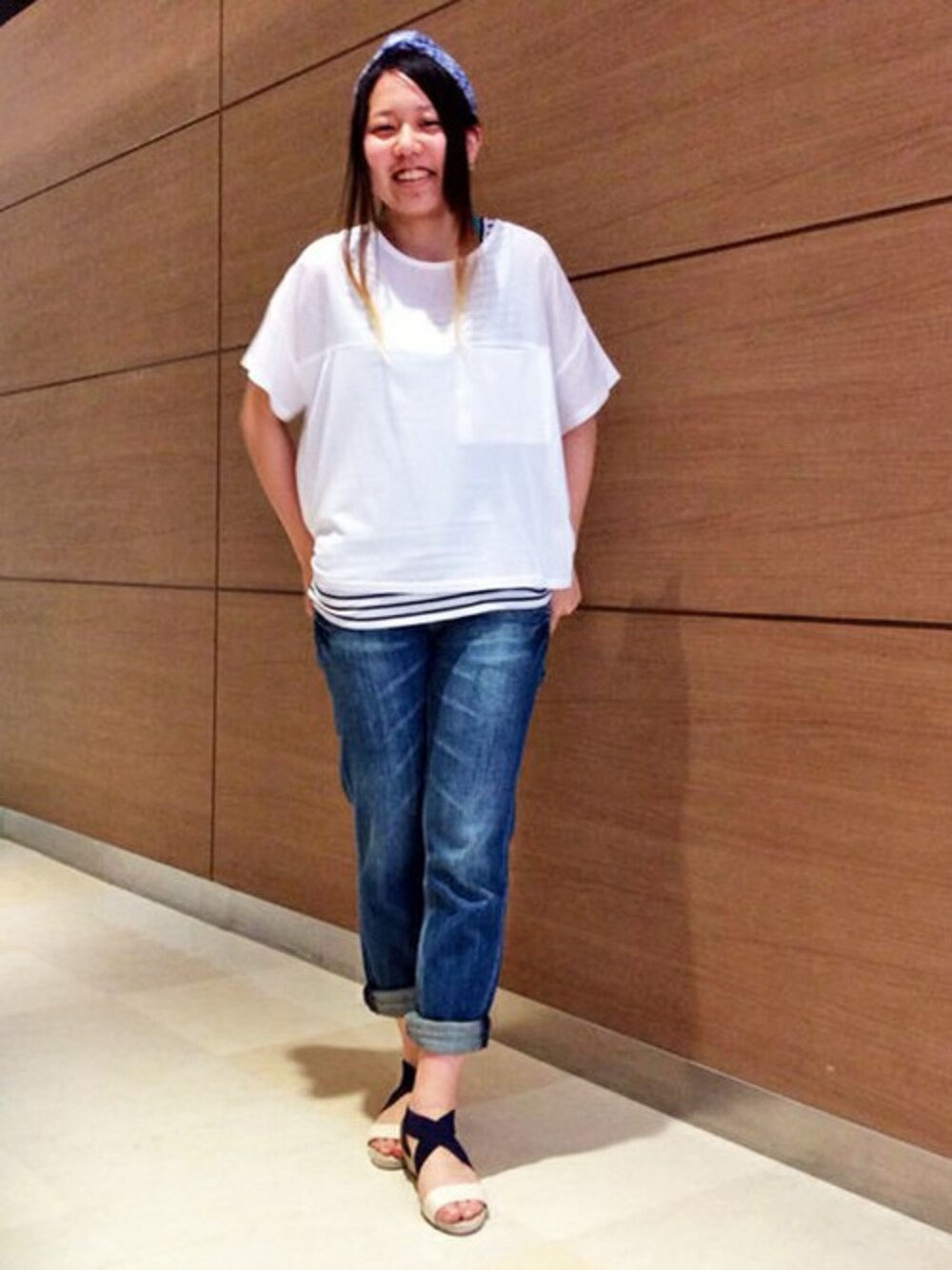 デイリーにつかえるデニムコーディネートです。 トップスは、異素材切り替えで透け感のあるシンプルな中にもデザイン性のある一枚。 カジュアルなボーダーや花柄のタンクトップをあわせるのがおすすめです♪