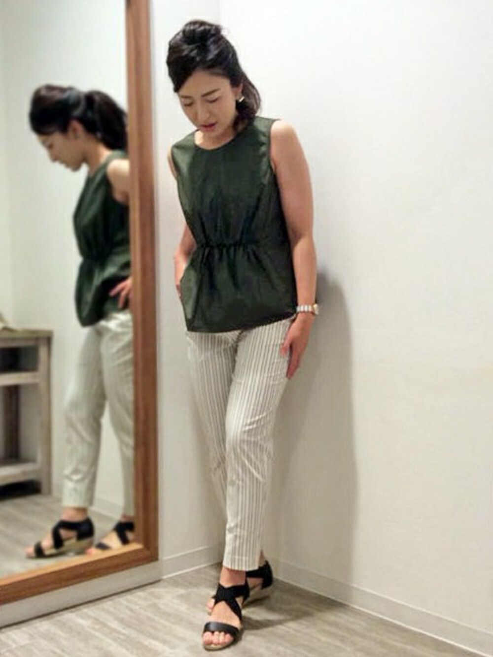 トレンドのカーキ×ホワイトのパンツコーディネートです。 トップスは、ウエストより少し上にあるギャザーがスタイルアップのポイント。 ストライプのパンツと合わせると、Iラインがスッキリします♪