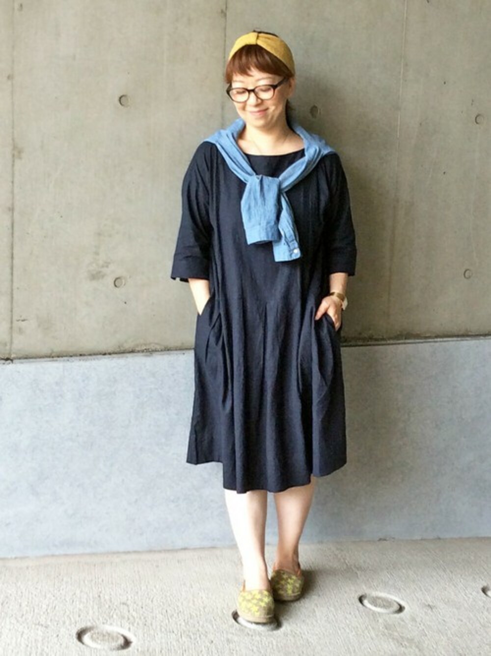 ゆったりらくちんリラックスコーディネートです♪ デニム風にみえるワンピースは、リネンレーヨン素材なので薄手でやわらかな着心地。 シャツやカーデを肩かけすると今年らしさがUPします!