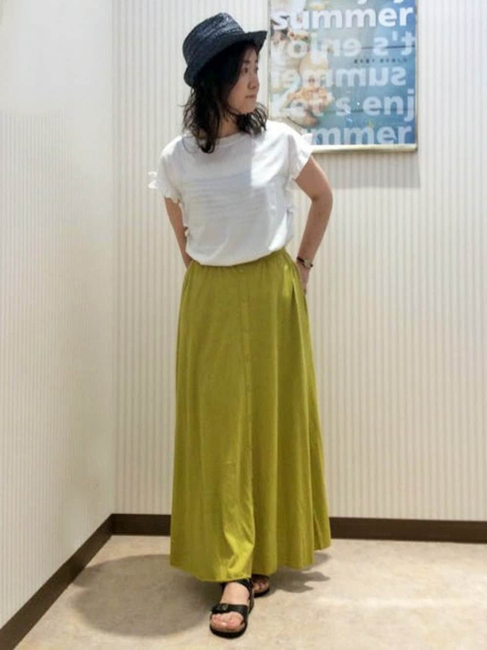 大人の女性らしいリラックススタイル。 トップスは、シンプルにみえて肩や袖の切替デザインと落ち感のある素材で女性らしいシルエットです。 スカートは、ウェストゴムがうれしいラクチンアイテム♪ マキシ丈なのでトップスをコンパクトにインすると脚長効果がUPします!