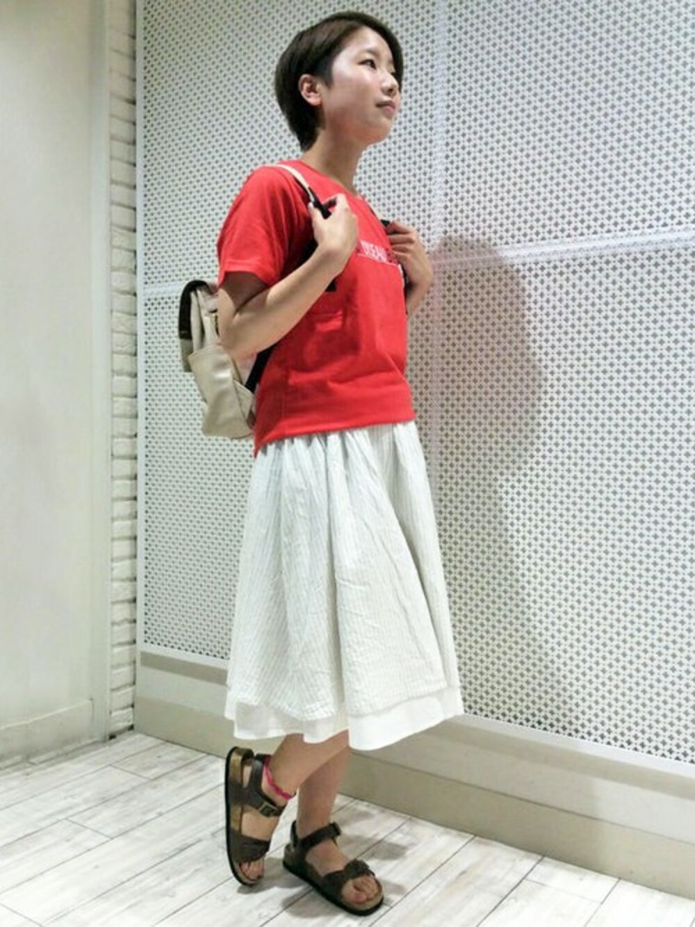 カジュアルなTシャツとナチュラルなスカートのミックスコーディネートです。 元気カラーのTシャツに、無地とストライプのリバーシブルスカートをプラス。 小さめのリュックをあわせて女の子らしくまとめました♪ 大きめのバックパックとも相性のいいコーディネートです。