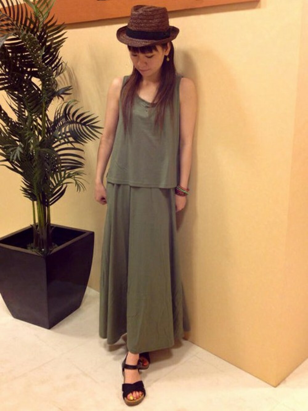 トレンドのカーキをメインに、シックにまとめた夏コーディネートです。 マキシ丈のワンピースは、タンクトップとセットになっていて、それぞれ単品でもつかえる優れもの♪ レーヨンのはいったやわらか素材で、リラックスした雰囲気はリゾートにもピッタリです。