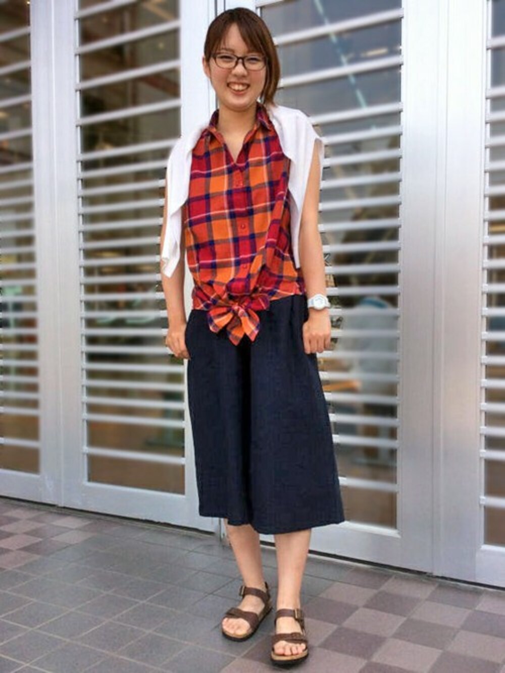 元気な夏のカジュアルコーディネートです。 夏らしい明るいカラーのチェック柄ブラウスは、ノースリーブ+前結びのトレンドデザイン♪ ガウチョをあわせるとメリハリのあるスタイリングになります。