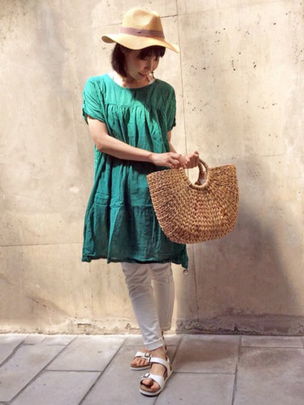涼しげな夏のカジュアルコーディネートです。 鮮やかなグリーンが爽やかなワンピースは、ほどよいシワ感がやさしい雰囲気で着心地も◎ ボトムを白であわせて、天然素材の小物をプラスすると夏らしさがUPします♪