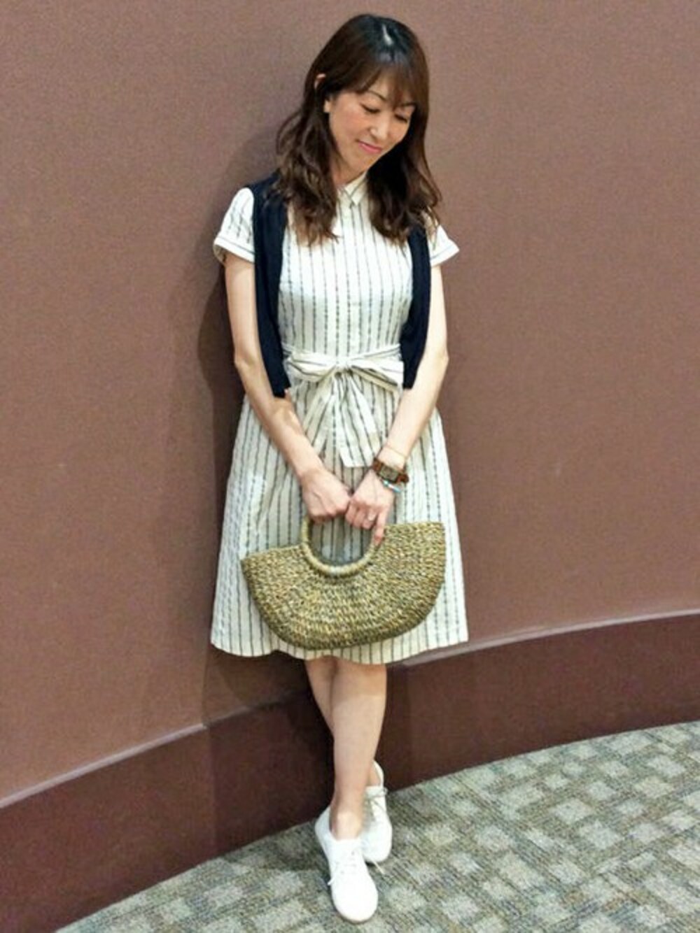 ストライプが涼しげなワンピースコーディネートです。 シャツワンピは、コットンリネン素材で暑い季節もさらりとした着心地です。 膝まである丈で一枚で着れるのもうれしいポイント♪ ネイビーの肩かけカーデが、シロベースのコーディネートのアクセントになります。