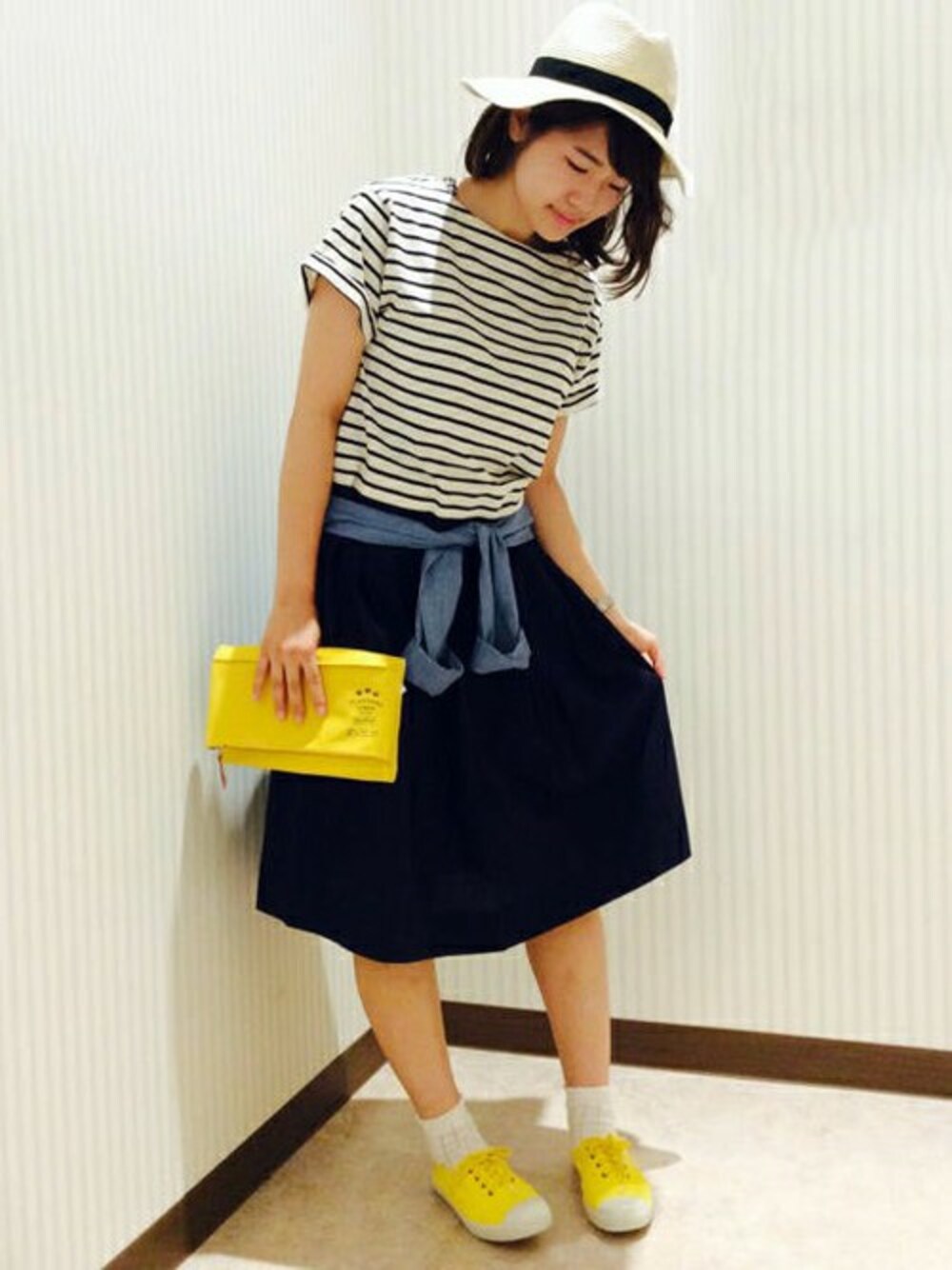 涼しげなネイビー×ホワイトの楽チンコーディネートです。 ボーダーTシャツとスカートにみえるのは、実はワンピース♪ 一枚でスタイル完成するうれしいアイテムです。 デニムシャツを腰巻き&小物を黄色で揃えてアクセントにしました。
