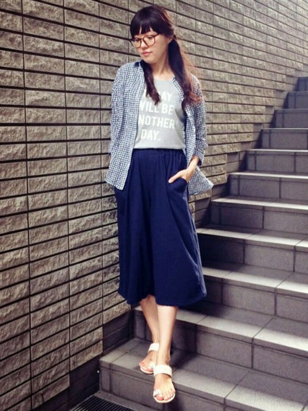 涼しげなネイビーのラクチンコーディネートです。 ギンガムチェックのシャツは、ワッシャー加工されていて夏らしいカジュアルな雰囲気。 トレンドのガウチョをあわせると、少し大人っぽいリラックススタイルに変身♪