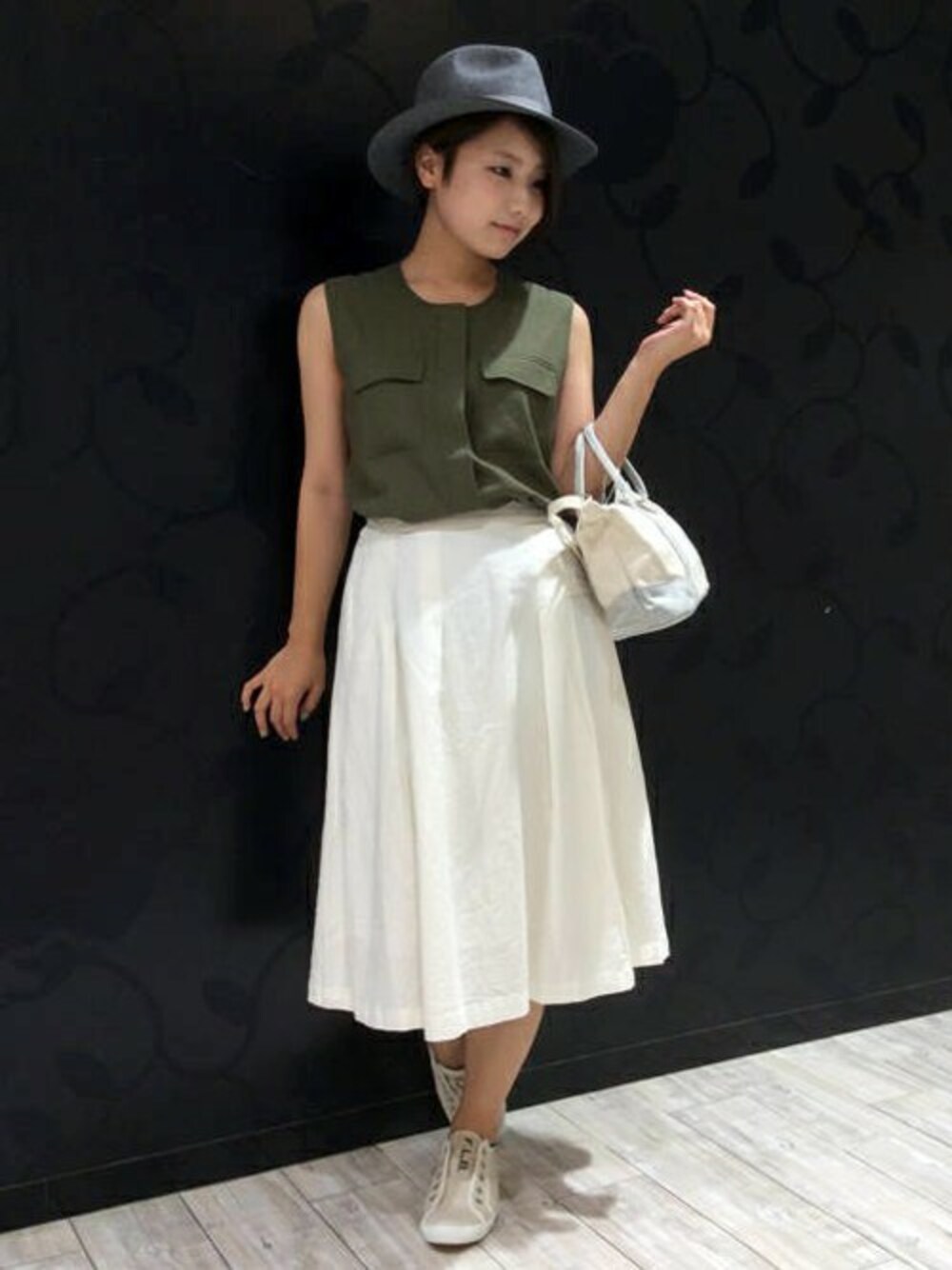 秋の要素をちりばめた、きれいめカジュアルコーディネートです。 ブラウスは、ノースリーブなので夏は一枚、秋はインにして活躍しそうなアイテムです。 大きめポケットがミリタリーな雰囲気で、今年らしい着こなしにピッタリ。 ミモレ丈スカートと合わせると大人っぽさがプラスされます♪