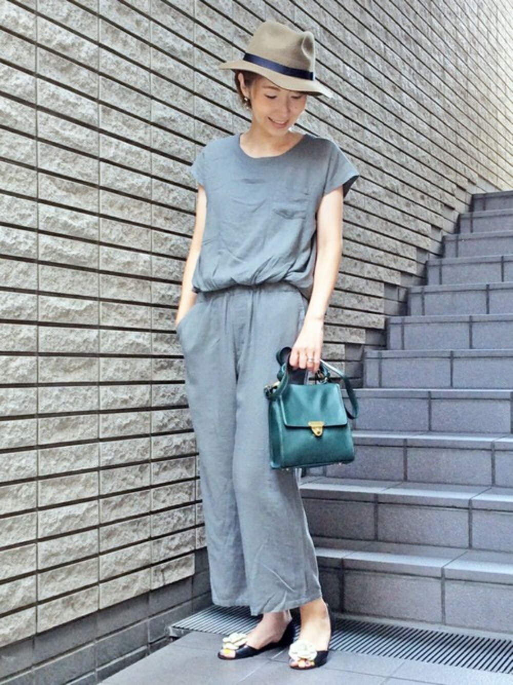 秋口におすすめの大人カジュアルコーディネート。 ワイドなシルエットの秋バージョンサロペットは、フロントはトップスインしているような仕様でウエストのゴム使いが程よいボリュームを作ってくれます。 少しレトロ感のあるバッグやハットをあわせると大人っぽさがUPします♪