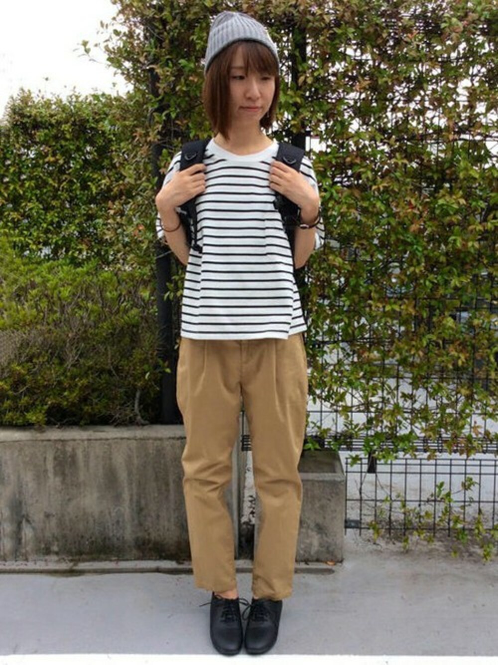 ボーダーT×パンツのシンプルコーディネートです。 少しショート丈のTシャツと、ほどよいゆる感のあるパンツの相性は◎ メンズライクなバックパックをあわせると今年らしさがUPします♪