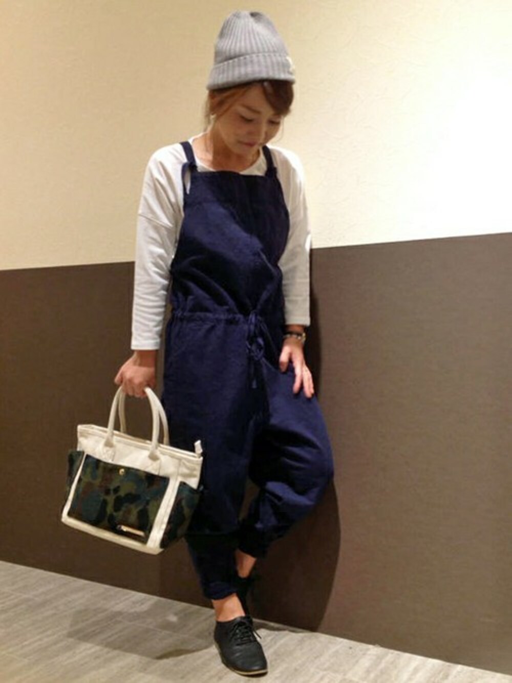 人気のサロペットコーディネートです。 サロペットは、ウェストマーク+スソ絞りがポイントになっています。 しっかり素材のシンプルなTシャツとニット帽をあわせてカジュアルに着こなすのがおすすめです♪