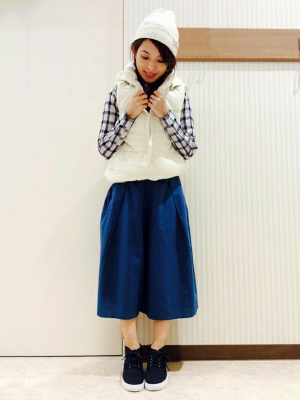 ホワイト×ネイビーの秋コーデです。 ベストは、箇所によって綿の量を変えることでスッキリ見える仕様になっています。 ホワイトはめずらしいのでおすすめです。 トレンドのガウチョとあわせると、ラフな中にも女性らしい雰囲気に♪